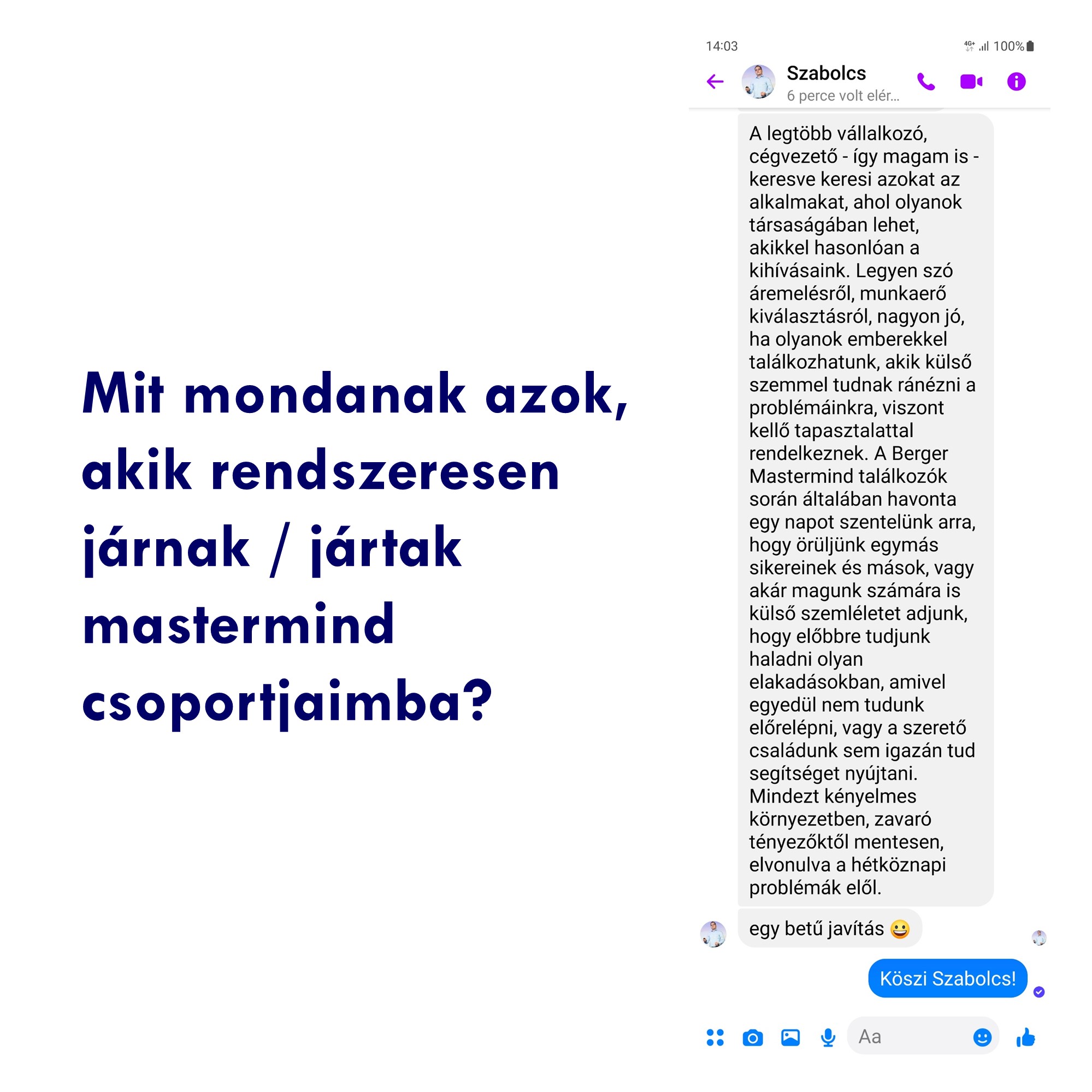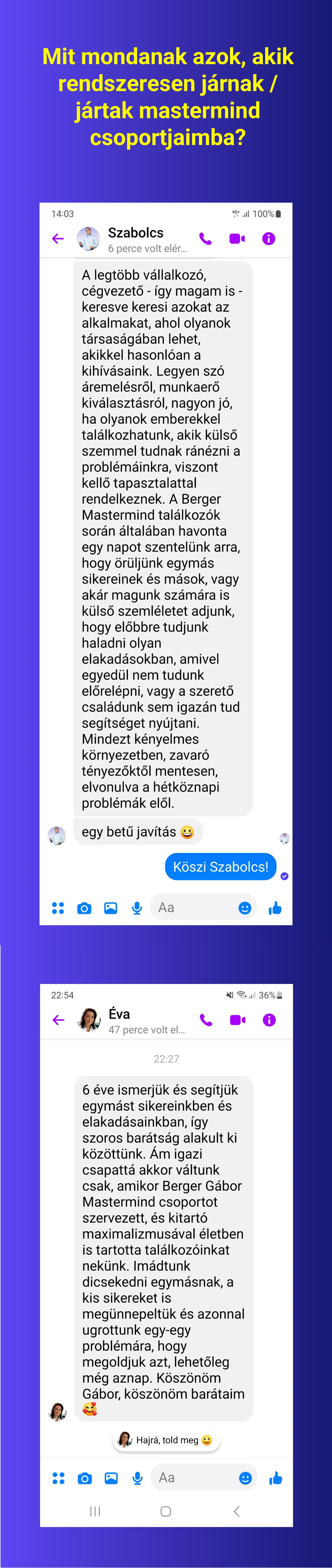 ➔ Te nem ismered még a mastermind közösségekben rejlő, szinte varázserejű potenciált, én viszont 2017 óta csinálom, és látom hogy működik. 10-ből 8 vállalkozó, cégvezető, ha egyszer kipróbálja, megismeri a társait, megnyílik, akkor maradni fog hosszú távon, több éven keresztül a csapatban. A lemorzsolódó 20% kávé, ásványvíz, pogácsa és forrócsoki költségét pedig elszámoljuk marketing kiadásként. Így hosszú távon nincs szükség trükkös apróbetűkre, hűségidőre, mert anélkül is megtérül a befektetett energia.